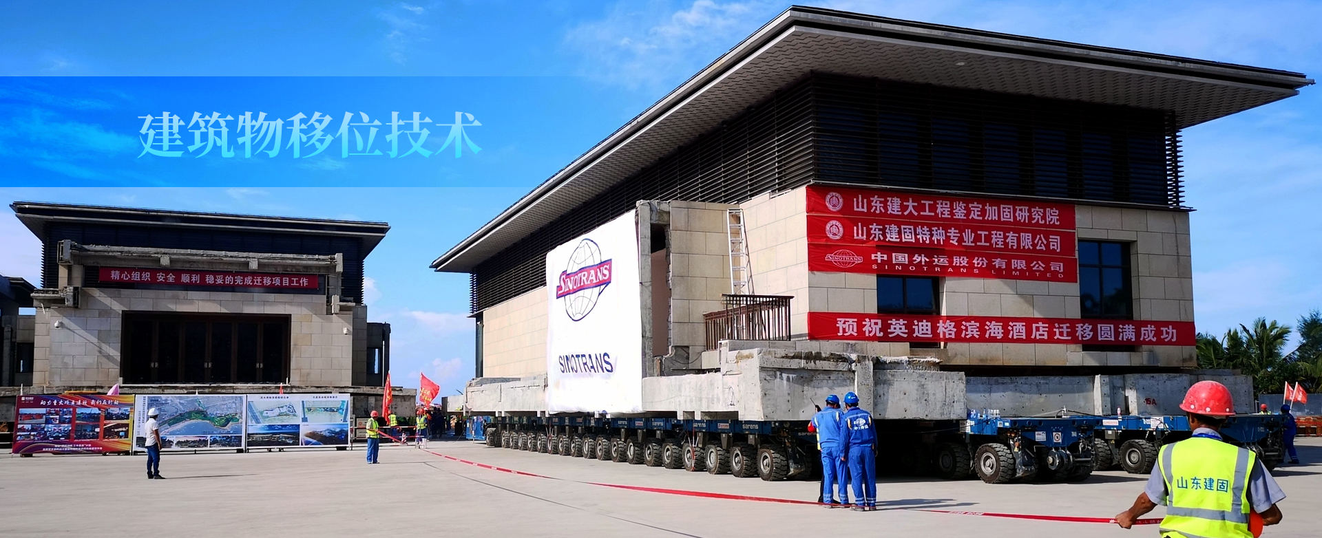 海南紅塘灣酒店為地下1層、地上2層鋼筋混凝土框架結(jié)構(gòu)。占地面積約2400㎡,總建筑面積4658㎡。遷移直線距離約500米,豎向頂升2.3米。紅塘灣酒店遷移工程的成功就位,標志著一個新的記錄誕生:目前國內(nèi)外首例不規(guī)則扇形車輛布置、國內(nèi)拖車移位單體建筑面積最大(4658㎡)、國內(nèi)拖車移位單體建筑重量最重(7500噸)。山東建筑大學(xué)工程鑒定加固研究院、山東建固特種專業(yè)工程有限公司成立于1992年,三十年一直秉承“篤志疑難躬行求新”的企業(yè)精神,完成建筑物鑒定與加固改造、建筑移位、建筑糾傾項目六萬余項。山東萊蕪高新區(qū)辦公樓平移項目,建筑面積24000㎡,重量35000噸,是國內(nèi)外最重平移工程;主持完成的